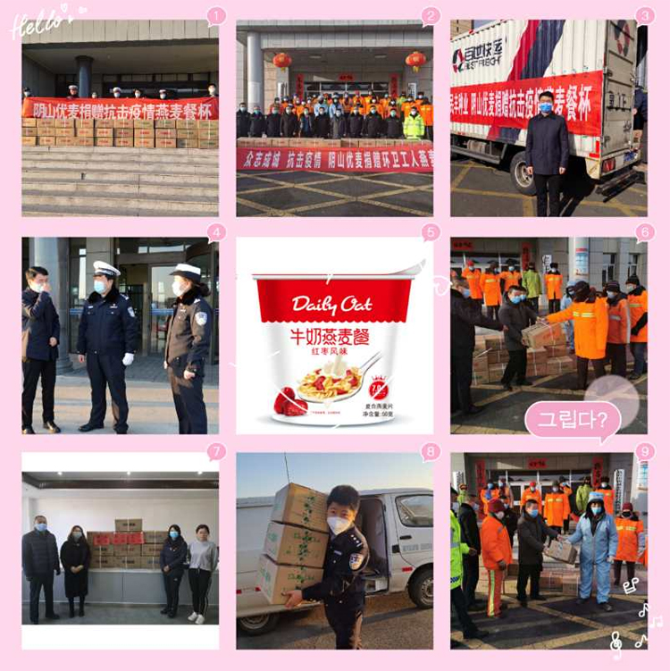 2月2日公司通過集寧區(qū)紅十字會捐贈燕麥餐杯9000只,2月7日通過察右中旗紅十字會捐贈燕麥餐杯 3300只,2月12日向抗擊在疫情一線的烏蘭察布市交警支隊(duì)捐贈燕麥餐杯1500只,2月14為堅(jiān)守疫情防控一線的城管環(huán)衛(wèi)人員送上燕麥餐杯1650只,2月16日為集寧區(qū)橋東街道泉山北街社區(qū)一線工作人員送上燕麥餐杯300只。截止目前,公司已累計(jì)捐贈燕麥餐杯15750只,為抗擊疫情一線的工作人員提供了健康、方便的營養(yǎng)支持!